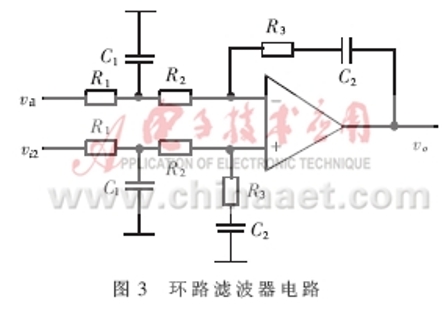 環(huán)路濾波器設(shè)計(jì)——環(huán)路濾波器形式和參數(shù)的選取是整個(gè)鎖相環(huán)電路設(shè)計(jì)與調(diào)試的關(guān)鍵。在壓控振蕩器和檢相器設(shè)計(jì)確定的情況下,環(huán)路濾波器的傳輸函數(shù)直接決定了整個(gè)環(huán)路的傳輸函數(shù),從而在很大程度上決定環(huán)路的噪聲性能、捕獲和跟蹤性能等。在鎖相環(huán)路設(shè)計(jì)中廣泛采用由有源比例積分濾波器組成的高增益二階環(huán)路,因?yàn)檫@種環(huán)路具有無(wú)條件穩(wěn)定性,而且有較大相位裕度。但是為了更好地抑制控制線中干擾、提高環(huán)路噪聲抑制性能,在高增益二階環(huán)的基礎(chǔ)上附加一級(jí)RC低通濾波器。其電路形式如圖3所示。