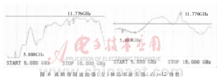 的連接線。濾波后采用低耗能的射頻放大器對(duì)信號(hào)進(jìn)行功率放大以彌補(bǔ)濾波器的通帶衰減。功率放大器電路設(shè)計(jì)主要是隔直電路的設(shè)計(jì),選用一級(jí)耦合微帶作為隔直電路,對(duì)11.776GHz信號(hào)增益可以達(dá)到10dB左右。圖6給出了用網(wǎng)絡(luò)分析儀測(cè)得的帶阻濾波器和功率放大器的s12特性。