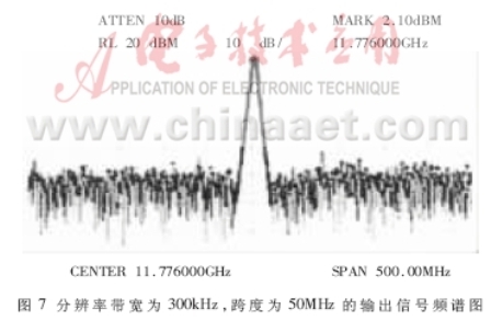 在整個(gè)鎖相頻率綜合器系統(tǒng),需要測(cè)量的電路單元主要有:分頻式鎖相環(huán)環(huán)路特性、高頻帶阻濾波器特性、高頻信號(hào)功率放大單元和整個(gè)頻率綜合系統(tǒng)的輸出頻譜特性。用Marconi 10kHz~1GHz信號(hào)發(fā)生器提供高精度46MHz參考信號(hào),用HP8592A頻譜分析儀測(cè)量輸出信號(hào)頻率特性。頻譜結(jié)果如圖7所示,系統(tǒng)輸出信號(hào)頻率點(diǎn)在11.776GHz,系統(tǒng)輸出信號(hào)功率為3.64dBm。用同樣頻譜分析儀測(cè)量系統(tǒng)輸出信號(hào)的單邊帶相位噪聲。取偏離載頻為1kHz的測(cè)試波形,測(cè)得其單邊帶相位噪聲為-72.8dBc/Hz@1kHz。