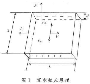 如圖1所示,一個N型半導體薄片,長度為L,寬度為S,厚度為d,在垂直于該半導體薄片平面的方向上,施加磁感應強度為B的磁場,若在長度方向通以電流Ic則運動電荷受到洛倫茲力的作用,正負電荷將分別沿垂直于磁場和電流的方向向導體兩端移動,并聚集在導體兩端形成一個穩(wěn)定的電動勢UH,這就是霍爾電動勢(或稱之為霍爾電壓),這種現(xiàn)象稱為霍爾效應。霍爾電壓的大小UH=RIB/d=KHICB,其中R為霍爾常數(shù);KH為霍爾元件的乘積靈敏度。