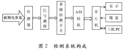 檢測系統(tǒng)構成如圖2,被測量經霍爾傳感器轉換為電壓信號,經信號調理電路和多路轉換開關選擇,通過A/D轉換器送給單片機,單片機采用89C51,是該系統(tǒng)的主控器,鍵盤選用2×4鍵盤,用于選擇被測量的種類,采用數(shù)碼管或液晶顯示被測量的大小。