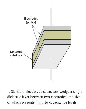 雙電層電容器(EDLC)正如它的字面意義那樣可以解決上述問題,它在相同的封裝內(nèi)增加了第二個電介層,這個電介層與第一層在中間隔離物的兩邊并行工作(圖3)。EDLC也采用無孔電介質(zhì),如活性碳、碳納米管、炭黑凝膠,并選用導(dǎo)電聚合物,其存儲容量要比標(biāo)準(zhǔn)的電解材料高出許多。額外層和更高效電介材料的這種組合能使電容容量提高近4個數(shù)量級。