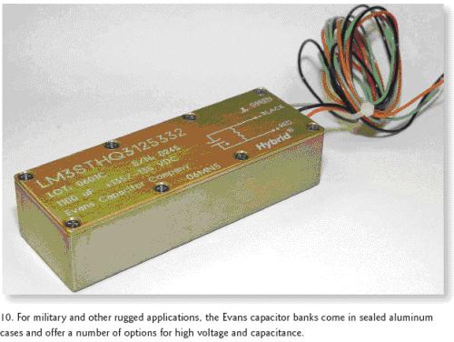 [page]EvansCapacitor公司的3STHQ3和3PTHQ3電容組器件則主要用于任務(wù)繁重的軍事應(yīng)用,它將公司的三個THQ3混合電容集成進了一個陽極電鍍、環(huán)氧密封的鋁殼中,整個尺寸為4.47×1.59×1.09英寸(圖10)。針對更高的工作電壓,3STHQ3組可以串聯(lián)電容的方式提供以下四種產(chǎn)品:0.004F/160Vdc,0.0028F/200Vdc,0.0019F/250Vdc和0.0011F/300Vdc。