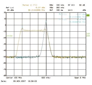 Spread Spectrum Oscillator),來降低系統(tǒng)輻射出來的EMI電磁輻射干擾。圖4則顯示一個單頻信號的頻譜圖以及對該信號展頻后的頻譜圖。從圖中可知展頻后的頻率信號如何降低原來在接近100MHz的峰值。