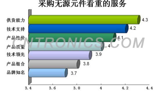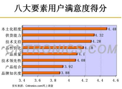 從柱狀圖可以看出,性價比、技術(shù)支持和供貨能力普遍得分很高。而產(chǎn)品組合和品牌知名度普遍得分較低。由此可見,在金融危機影響依然持續(xù)的情況下電子整機廠商更加重視電子元器件的供貨能力和技術(shù)支持能力。[page]