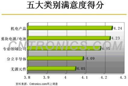 在五大類別的用戶滿意度調(diào)查中,回復者對機電類產(chǎn)品和模塊電源/電池類公司滿意度較高,而對無源元件和分立半導體公司滿意度最低,電子元件技術(shù)網(wǎng)調(diào)查分析發(fā)現(xiàn):
