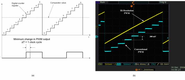 圖3(b) 顯示了運(yùn)行中的高分辨率PWM 及標(biāo)準(zhǔn)PWM 技術(shù)。參考軟件圖形的斜面,當(dāng)禁用高分辨率功能時(shí)會(huì)產(chǎn)生階梯現(xiàn)象。當(dāng)啟用高分辨率功能時(shí),屏幕上顯示了黃色線跡。很容易看出高分辨率PWM 降低了幾個(gè)數(shù)量級(jí)的PWM 輸出量化。對(duì)于反向器等PWM 驅(qū)動(dòng)器件而言,由于PWM 的時(shí)間分辨率簡(jiǎn)單轉(zhuǎn)換為輸出電壓分辨率,高分辨率PWM產(chǎn)生的增強(qiáng)分辨率有助于降低因有限輸出分辨率而導(dǎo)致的有限周期現(xiàn)象的發(fā)生。