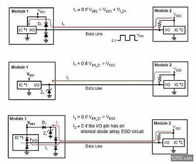 突崩式TVS二極管雖然擁有高突波規(guī)格,但相對較大的電容值使得這類元件成為負載切換開關(guān)與直流電源匯流排保護應(yīng)用的較佳選擇,相反地,二極管陣列適當?shù)耐徊ㄒ?guī)格與較小的電容值則較適用于高速資料連接線的保護,突崩式TVS與二極管陣列通??梢越换ナ褂?,但部份電路在選擇適合採用的元件時則需要經(jīng)過仔細的分析。(圖四)描述了當存在一個電流可以透過資料線流經(jīng)二極管陣列路徑時所發(fā)生的向后驅(qū)動問題,如果VDD2大于VDD1,那么資料連接線有可能意外地提供電源給模組1,這個情況可能會造成邏輯晶片的電源啟動問題,或是在斷電后模組1上指示燈被點亮的異常狀況。