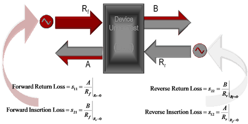S11定義為端口1反射的能量占端口1入射信號的比例,S21定義為傳輸?shù)紻UT端口2 的能量占端口1入射信號的比例。參數(shù)S11和S21為前向S-參數(shù),這是因為入射信號來自端口1的射頻源。對于從端口2入射信號,S22為端口2反射的能量占端口2入射信號的比例,S12為傳輸?shù)紻UT端口1的能量占端口2入射信號的比例。它們都是反向S-參數(shù)。
