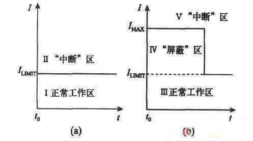 當(dāng)負(fù)載電流超過限制電流ILIMIT 不太多且持續(xù)作用時間不太長時,我們希望過流保護(hù)電路能保持LDO 不中斷工作,因此需要采用“屏蔽”模式屏蔽掉部分可以讓LDO 不中斷運行的過流信號,對于過流幅值和持續(xù)作用時間超過范圍的過流信號,過流保護(hù)電路又能采取中斷LDO 工作的模式。傳統(tǒng)的“中斷”模式電流保護(hù)電路工作狀態(tài)如圖1(a)所示,分為正常工作區(qū)Ⅰ和“中斷”區(qū)Ⅱ,當(dāng)負(fù)載電流不超過ILIMIT 時,LDO 工作在正常工作區(qū),當(dāng)負(fù)載電流超過ILIMIT 時LDO 進(jìn)入“中斷”區(qū)。加入“屏蔽”模式后的過流保護(hù)電路工作狀態(tài)如圖1(b),分為正常工作區(qū)Ⅲ、屏蔽區(qū)Ⅳ以及中斷區(qū)Ⅴ,當(dāng)負(fù)載電流小于ILIMIT 時,LDO 處于正常工作區(qū),當(dāng)過流信號的幅值在ILIMIT 和最大幅值電流IMAX 之間,持續(xù)作用時間在t=tMAX 之內(nèi)即同時滿足ILIMIT ≤ ILOAD ≤ IMAX,t ≤tMAX 時,LDO 進(jìn)入屏蔽區(qū),這個范圍之外的過流信號將進(jìn)入中斷區(qū)。對比圖1(a)和(b)可以看出,改進(jìn)過流保護(hù)電路后的LDO 的正常工作區(qū)包括圖1(b)的正常工作區(qū)Ⅲ和“屏蔽”區(qū)Ⅳ,增大了工作區(qū)的范圍,提高了LDO 的工作效率。