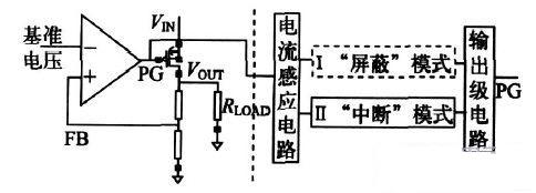 包含過流保護(hù)電路的LDO整體框圖如圖2所示,虛線左邊是LDO 主體電路,包括誤差放大器、功率管、負(fù)載電阻以及分壓電阻。虛線右邊部分為電流保護(hù)電路,主要作用是感應(yīng)并檢測負(fù)載電流是否超過限制電流,然后通過控制功率管來決定是否使LDO 中斷運行,包括電流感應(yīng)電路和控制電路。傳統(tǒng)的過流保護(hù)電路只采用圖2 中實框Ⅱ所示的“中斷”模式(不包括虛框),對于任何負(fù)載過流情況,不論持續(xù)作用時間如何,都使LDO 中斷工作;本文在傳統(tǒng)的“中斷”模式基礎(chǔ)上,增加了“屏蔽”模式(如圖2 中虛框Ⅰ),能有效屏蔽希望LDO不中斷工作的過流信號,使LDO更高效運行,同時保留“中斷”模式,保證LDO 安全工作。
