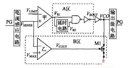 圖3 是改進(jìn)前后的過流保護(hù)電路圖。不加虛框部分是傳統(tǒng)的“中斷”模式過流保護(hù)電路,由電流感應(yīng)電路、比較電路以及輸出級電路組成。電流感應(yīng)電路采樣功率管電流。采樣得到的電流和限制電流ILIMIT 分別轉(zhuǎn)化為比較器的兩輸入端電壓VSENSE 和VLIMIT 并進(jìn)行比較,得到VCO。VCO作用于輸出級電路以控制功率管柵極電壓。如果負(fù)載過流,過流保護(hù)電路使得功率管柵極電壓PG 為高電平,強行使LDO中斷。