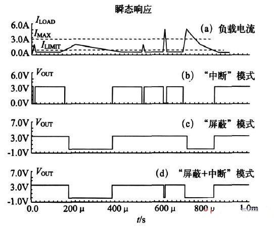 圖5 中(a)曲線表示負(fù)載電流幅值和作用時間的關(guān)系,ILIMIT 和IMAX 分別為限制電流和最大幅值電流。圖5 中(b)、(c)和(d)曲線分別為采用傳統(tǒng)“中斷”模式、“屏蔽”模式以及“屏蔽+ 中斷”模式過流保護(hù)電路后LDO 的輸出電壓波形。