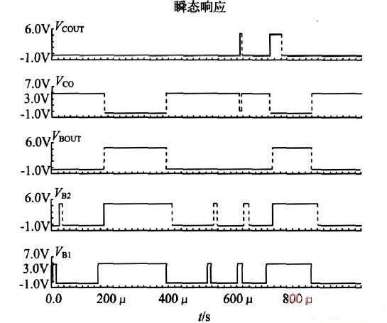 “屏蔽”模式的邏輯關(guān)系如圖4 所示,其中VB1和VCOUT 分別為比較器甲和乙的輸出信號,VB1 經(jīng)過一個延遲時間后輸出信號為VB2,屏蔽電路輸出電壓為VBOUT,VCO為屏蔽電路的輸出端。VB1、VB2和VBOUT的波形反應(yīng)了屏蔽電路的邏輯關(guān)系,只有當(dāng)VB1 和VB2 同時為高電平,VBOUT 才為低電平,否則VBOUT 一直為高電平,因此屏蔽電路屏蔽了延遲時間內(nèi)的脈沖信號,保持寬脈沖信號;VCOUT為使能端,只要VCOUT為高電平,VCO 立即變?yōu)榈碗娖健?/p>