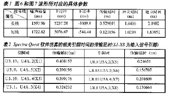 式中,e為介電常數(shù),r為電阻率,w為線寬,l0為芯片之間的平均距離。由式(3)可以看出,信號(hào)線長(zhǎng)度對(duì)傳輸質(zhì)量影響很大,可能使信號(hào)在傳輸過(guò)程中產(chǎn)生畸變。信號(hào)傳輸質(zhì)量隨著線長(zhǎng)的增加而變差,對(duì)于過(guò)長(zhǎng)的信號(hào)線,應(yīng)采用源端或終端匹配的方法來(lái)改善傳輸質(zhì)量。利用信號(hào)完整性仿真工具,可以方便地模擬從驅(qū)動(dòng)端到各芯片的延時(shí),然后結(jié)合仿真結(jié)果對(duì)布局布線進(jìn)行調(diào)整,以達(dá)到預(yù)定的要求。
