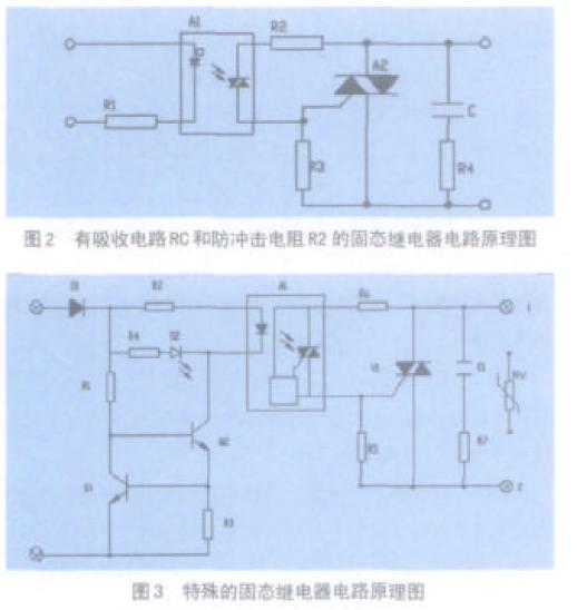 圖1、圖2 和圖3 三種電路都能實(shí)現(xiàn)固態(tài)繼電器的功能。圖1 是固態(tài)繼電器最簡單的電路原理圖,圖中A1 是交流光耦,A 2 是雙向可控硅。常用在小型的S S R ,使用時,用戶往往在外面增加器件來改善性能。圖2 是在圖1 的基礎(chǔ)上增加了RC 吸收電路和防沖擊電阻R2 。R 2是保護(hù)光耦,抑制在導(dǎo)通瞬間流過光耦的沖擊電流。附加這些器件后,大大改善了SSR 的EMC 特性和浪涌對光耦的沖擊性能。因此該電路常用在可靠性較高的場合。圖3 是一種特殊的電路,常用在高可靠性和E M C 等級較高的SSR 設(shè)計中。圖中的二極管D1 可防止輸入反極性。由Q1、Q2、R1 及R3 組成恒流電路,保證當(dāng)輸入電壓變化時,光耦A(yù) 1 的電流恒定。R C 電路C 1 、R 7 和R 6 的功能與圖2 的相同。該電路還增加了壓敏電阻R V 。R V不僅加強(qiáng)了S S R 的過壓保護(hù)能力,而且大大改善了其E M C 性能。