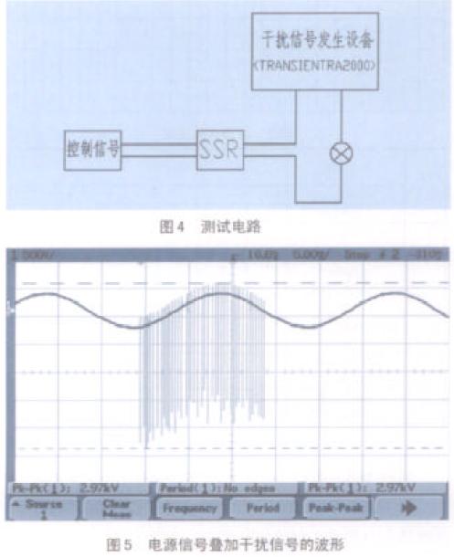 圖4 所示為測試電路。對SSR 來說,有信號源(穩(wěn)壓電源)、小于1 米的連線、負(fù)載及有關(guān)儀器;圖5 為電源信號疊加干擾信號的波形。