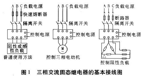 單相SSR為四端有源器件,其中兩個(gè)輸入控制端,兩個(gè)輸出端,輸入輸出間為光隔離,輸入端加上直流或脈沖信號到一定電流值后,輸出端就能從斷態(tài)轉(zhuǎn)變成通態(tài)。而三相交流固態(tài)繼電器則是集三只單相交流固態(tài)繼電器為一體,并以單一輸入端對三相負(fù)載進(jìn)行直接開關(guān)切換,可方便地控制l一相交流電機(jī)、加熱器等三相負(fù)載,圖1為三相交流固態(tài)繼電器的基本接線圖。三相交流固態(tài)繼電器的相與相問,輸入輸出間,以及與基板之間絕緣電壓大于2 000 VAC,其他基本指標(biāo)與相應(yīng)的單相固態(tài)繼電器相同。需要指出的是對實(shí)際負(fù)載電流不大的場合,比如實(shí)驗(yàn)室教學(xué),三相SSR使用起來比較方便,但電流大時(shí)發(fā)熱亦大,這時(shí)使用三只單相SSR更為可靠。