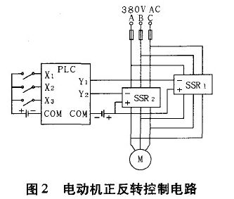 圖2為PLC控制的三相交流電動機(jī)正反轉(zhuǎn)控制電路,其中X1、X2、X3,分別表示PLC的輸入,控制電動機(jī)的轉(zhuǎn)動方向與起停;Y1、Y1表示PLC的輸出。當(dāng)Y1有效時(shí),SSR1輸入端得到DC24V的直流信號,則三相輸出端從斷態(tài)轉(zhuǎn)變成通態(tài),三相交流電動機(jī)得電,反轉(zhuǎn);同理當(dāng)Y 有效時(shí),SSR2的三相輸出端接通,因A、c換向則電動機(jī)正轉(zhuǎn)。