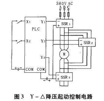 圖3為PLC控制的Y-△降壓起動控制電路,其中X1、X2分別表示PLC的輸入,控制電動機(jī)的起停;Y1、Y2、Y3表示PLC的輸出。當(dāng)Y1和Y3有效時(shí),對應(yīng)的SSR1和SSR3也同時(shí)有效,此時(shí)電動機(jī)為Y型接法,延時(shí)幾秒后,Y3失效,Y2有效,則對應(yīng)的SSR3三相輸出端斷開,SSR2三相輸出端合上,則電動機(jī)變?yōu)椤鹘臃?,完成了Y一△降壓起動。