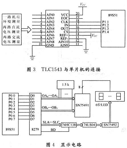 直流電壓、交流電壓以及機房溫濕度的測量選用TLC1543,TLC1543為10位11通道的A/D轉換器,與單片機的連接如圖3所示。機房環(huán)境測量(溫度、濕度)采用JWS溫濕度變送器,輸出信號為標準0~5V直流電壓信號;直流電壓的數(shù)據(jù)采集經電阻分壓后直接送至A/D轉換器,交流電壓的采集經分壓整流后也直接送至A/D轉換器。