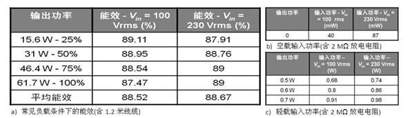 表 1:基于 NCP1250 的 65 W 演電源適配器演示板能效測(cè)試結(jié)果。