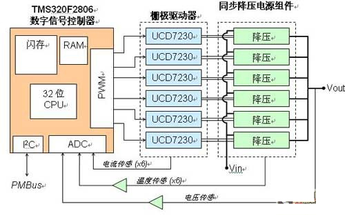 TI推出的32位TMS320F2806數(shù)字信號控制器(DSC)運(yùn)行在100MHz頻率下,并且以電源應(yīng)用為目標(biāo)。在本例中,其在軟件中實(shí)施電壓模式控制,該軟件使用一個在PWM開關(guān)頻率上進(jìn)行采樣的單通道2極點(diǎn)2零點(diǎn)數(shù)字補(bǔ)償器。隨后產(chǎn)生的占空比值將被傳給每一個降壓相(所有為實(shí)現(xiàn)相位平衡所作的占空比調(diào)節(jié)除外)。通過使用片上12位模數(shù)轉(zhuǎn)換器(ADC)獲得系統(tǒng)輸出電壓反饋。MOSFET溫度在整個ADC中均為可用,以實(shí)現(xiàn)監(jiān)控的目的,并且片上內(nèi)部集成電路(I2C)端口提供了對PMBus™通信的支持。針對同步降壓應(yīng)用專門設(shè)計了一款UCD7230柵極驅(qū)動器,從而提供了采用TITrueDrive™輸出架構(gòu)的雙通道4-AMOSFET驅(qū)動器、周期性電流限制以及一個內(nèi)置低失調(diào)、高增益、差分電流傳感放大器。