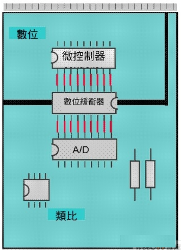 圖注: 使用高分辨率 SAR 模擬數(shù)字轉(zhuǎn)換器,轉(zhuǎn)換器電源與接地應(yīng)連接至模擬面。模擬數(shù)字轉(zhuǎn)換器的數(shù)字輸出應(yīng)有緩沖器,使用外部三態(tài)輸出緩沖器。這些緩沖器隔開模擬面與數(shù)字面,并提供高驅(qū)動(dòng)能力。
