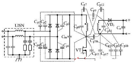 在圖1所示的反激式開關(guān)電源中,變換器工作于連續(xù)模式時(shí),開關(guān)管VT導(dǎo)通后,B點(diǎn)電位低于A點(diǎn),一次繞組匝間電容便會(huì)充電,充電電流由A流向B;VT關(guān)斷后,寄生電容反向充電,充電電流由B流向A。這樣,變壓器中便產(chǎn)生了差模傳導(dǎo)EMI。同時(shí),電源元器件與大地之間的電位差也會(huì)產(chǎn)生高頻變化。由于元器件與大地、機(jī)殼之間存在著分布電容,便產(chǎn)生了在輸入端與大地、機(jī)殼所構(gòu)成回路之間流動(dòng)的共模傳導(dǎo)EMI電流。