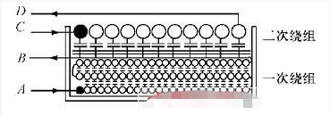 在開關(guān)電源中,輸入整流后的電流為尖脈沖電流,開關(guān)開通和關(guān)斷時(shí)變換器中電壓、電流變化率很高,這些波形中含有豐富的高頻諧波。另外,在主開關(guān)管開關(guān)過程和整流二極管反向恢復(fù)過程中,電路的寄生電感、電容會(huì)發(fā)生高頻振蕩,以上這些都是電磁干擾的來源。開關(guān)電源中存在大量的分布電容,這些分布電容給電磁干擾的傳遞提供了通路,如圖2所示。圖2中,LISN為線性阻抗穩(wěn)定網(wǎng)絡(luò),用于線路傳導(dǎo)干擾的測量。干擾信號(hào)通過導(dǎo)線、寄生電容等傳遞到變換器的輸入、輸出端,形成了傳導(dǎo)干擾。變壓器的各繞組之間也存在著大量的寄生電容,如圖3所示。圖3中,A、B、C、D4點(diǎn)與圖1中標(biāo)識(shí)的4點(diǎn)相對(duì)應(yīng)。