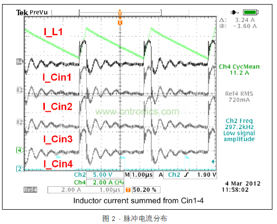 圖 3 顯示的范圍圖片涵蓋所有四個開關(guān)階段中的電感器電流與去耦合通道 1 的輸入電容器的脈沖電流。