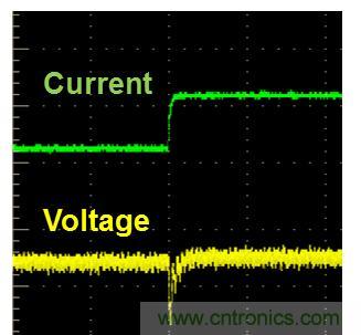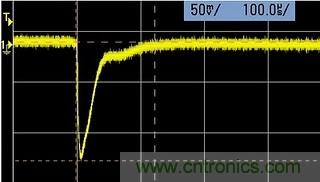 這是任何電源都存在的正?,F(xiàn)象。當(dāng)負(fù)載吸收電流發(fā)生跳變的瞬間,就會(huì)造成電源輸出端的電壓瞬間偏離設(shè)定值。這個(gè)示波器屏幕的截圖(圖1),就是當(dāng)我的一個(gè)電源的負(fù)載電流,從1mA 瞬間變化到500mA時(shí), 輸出電壓經(jīng)歷了約30uS 瞬間變化。