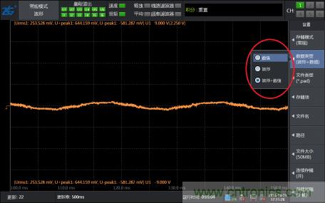 第四步,找到了想要觀察的波形幀之后,可以通過“FORM按鍵調(diào)整界面的窗口時(shí)間,對(duì)波形進(jìn)行任意放大或縮小”并可以調(diào)出光標(biāo)測(cè)量任意兩點(diǎn)的橫縱軸數(shù)據(jù)??吹竭@里我相信大部分人已經(jīng)可以找到自己想要看的波形了。但是想要把波形存儲(chǔ)記錄下來怎么辦,而且想要長(zhǎng)時(shí)間記錄可以實(shí)現(xiàn)嗎?不要急,PA功率分析儀還提供波形保存記錄功能。