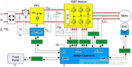 展示了柵極驅(qū)動(dòng)、通信和反饋信號(hào)隔離的典型驅(qū)動(dòng)電路如圖4所示。在該系統(tǒng)中,隔離的Σ-Δ ADC用來(lái)測(cè)量電機(jī)繞組電流,數(shù)字位流則由電機(jī)控制IC上的數(shù)字過(guò)濾電路進(jìn)行處理。位置編碼器包含一個(gè)ASIC,由其通過(guò)一個(gè)隔離式RS-485接口將位置和速度數(shù)據(jù)發(fā)送給電機(jī)控制IC。其他隔離式串行接口包括連接PFC的I2C接口以及連接前面板的隔離式RS-232鏈路。在此例中,PWM信號(hào)與逆變器模塊隔離,IGBT由一個(gè)嵌入該模塊中的電平轉(zhuǎn)換柵極驅(qū)動(dòng)器驅(qū)動(dòng)。