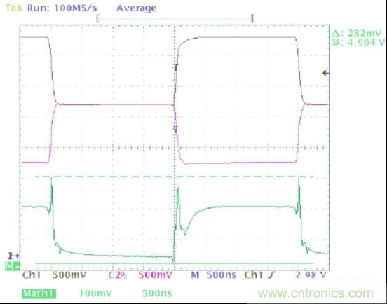 圖1中的波形顯示了一個(gè)可以在典型CAN收發(fā)器的輸出上觀察到的共模噪聲。在這幅圖像中,黑色軌跡線(通道1)顯示CANH,紫色軌跡線(通道 2)顯示的是CANL,并且綠色軌跡線(數(shù)據(jù)功能)是CANH與CANL的和。這個(gè)求和的過程給出了一個(gè)波形,它的值等于此時(shí)一個(gè)指定點(diǎn)上共模電壓的2 倍。