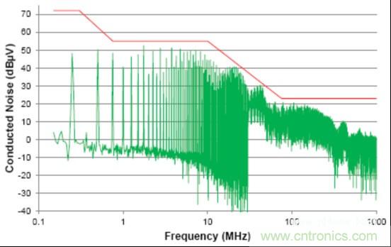 由于信號(hào)的共模部分能夠與系統(tǒng)(或與外部系統(tǒng))中的其它分量耦合在一起(通過輻射或傳導(dǎo)路徑),這個(gè)共模噪聲直接影響放射性能。這個(gè)器件的傳導(dǎo)放射按照工業(yè)電氣工程/電子 (IBEE) 茨維考技術(shù)的工程服務(wù)進(jìn)行測(cè)量;如圖2中所示,這個(gè)器件的傳導(dǎo)放射連同一個(gè)普通汽車原始設(shè)備制造商(OEM)限值線一同繪制。