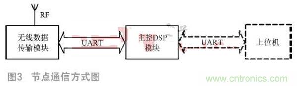 在傳感器網絡中,采用ZigBee通信協(xié)議時,節(jié)點被分為Coordinator、Router以及End Device三種。Coordinator負責系統(tǒng)的初始化工作,選擇網絡的信道等參數(shù)建立網絡,供其他節(jié)點加入;Router負責節(jié)點之間命令消息的路由轉發(fā)實現(xiàn);End Device負責任務是消息的發(fā)送和接收,只能和父節(jié)點進行數(shù)據(jù)通信,不具有路由轉發(fā)的功能。在本系統(tǒng)中,Sink節(jié)點主要負責監(jiān)控網絡的建立、上位機命令的分析處理和操作、數(shù)據(jù)的收集等任務,是整個網絡的數(shù)據(jù)存儲和處理中心,在上位機和監(jiān)控網絡之間起到橋梁的作用,是系統(tǒng)應用中的Coordinator。監(jiān)控網絡區(qū)域內的待定位節(jié)點要具備消息轉發(fā)與路由其他節(jié)點的能力,需要可以給所有節(jié)點發(fā)送消息,也可以接收到所有節(jié)點的消息,是系統(tǒng)應用中的Router。每個節(jié)點由無線數(shù)據(jù)傳輸模塊和主控DSP模塊組成,同一節(jié)點的兩個模塊之間通過UART總線進行通信。節(jié)點之間通過無線RF射頻方式進行通信。Sink節(jié)點與上位機使用UART總線進行通信,未知節(jié)點的通信方式中并不包含該通信方式。節(jié)點的通信方式如圖3所示。