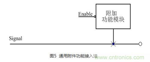 在高速信號(hào)線上,通常會(huì)附加一些功能,這些功能通常會(huì)帶來(lái)不利的影響,如會(huì)產(chǎn)生很大的寄生電容,這個(gè)電容視具體的電路模塊而定。如果忽略這個(gè)電容,可能會(huì)影響這個(gè)信號(hào)的頻率。最不幸的是,就算您注意到了這個(gè)電容,由于附加的功能模塊產(chǎn)生的電容太大,似乎也無(wú)能為力。通用附件功能接入法如圖5所示: