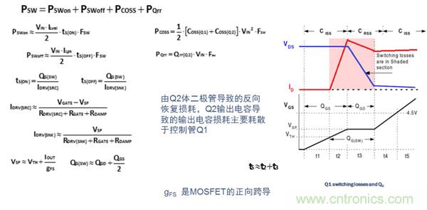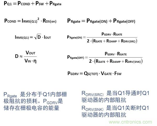 對(duì)于高頻應(yīng)用(>MHz),控制管Q1的選用應(yīng)針對(duì)降低開關(guān)損耗進(jìn)行優(yōu)化。Q1損耗的計(jì)算公式如下: