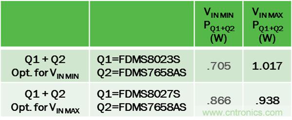 為優(yōu)化轉(zhuǎn)換器能效,首先根據(jù)VIN選擇損耗最小的Q1,然后選擇產(chǎn)生損耗最小的Q2。本例中, 無論VIN最小或最大,最佳的Q2是相同的,都為FDMS7658AS(但并不總是如此,特別是具有寬VIN范圍或高FSW時(shí))。