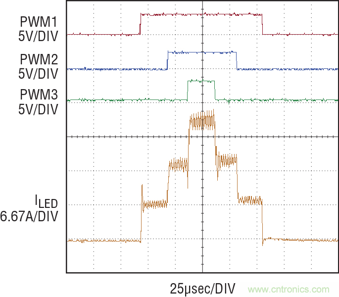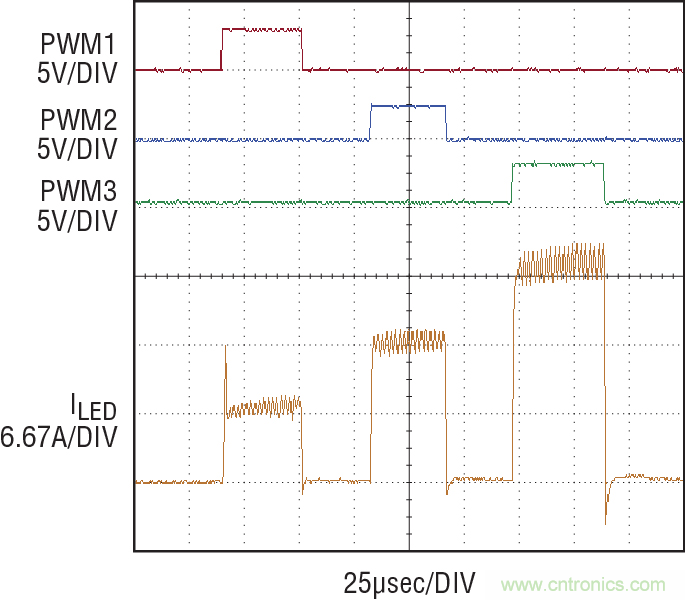 圖 5:LT3744 在 3 種穩(wěn)定電流狀態(tài)之間轉(zhuǎn)換,斷開(kāi)時(shí)間不到 3 個(gè)開(kāi)關(guān)周期。