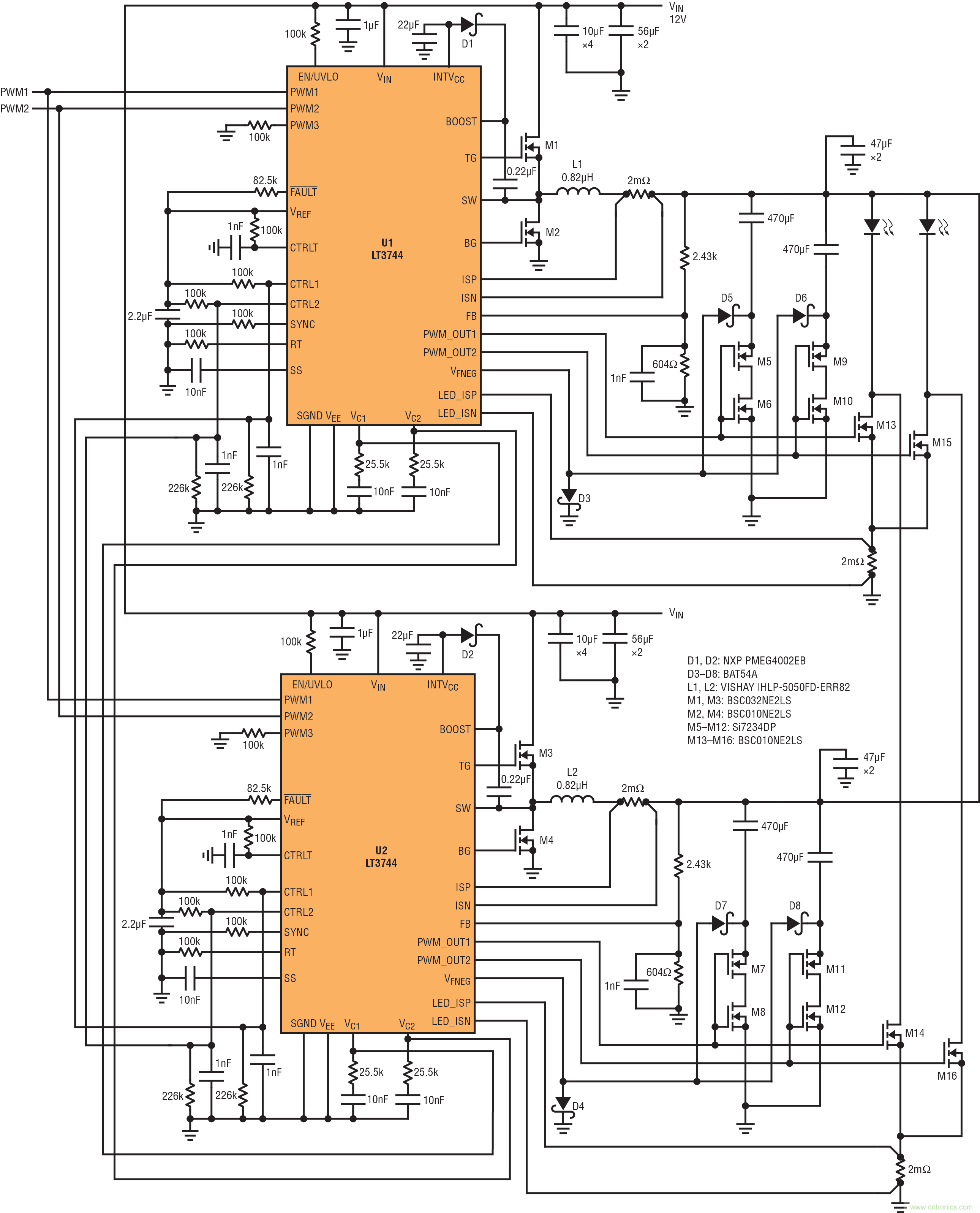 兩個(gè) LT3744 LED 驅(qū)動(dòng)器并聯(lián)以組成 324W 雙 LED 驅(qū)動(dòng)器