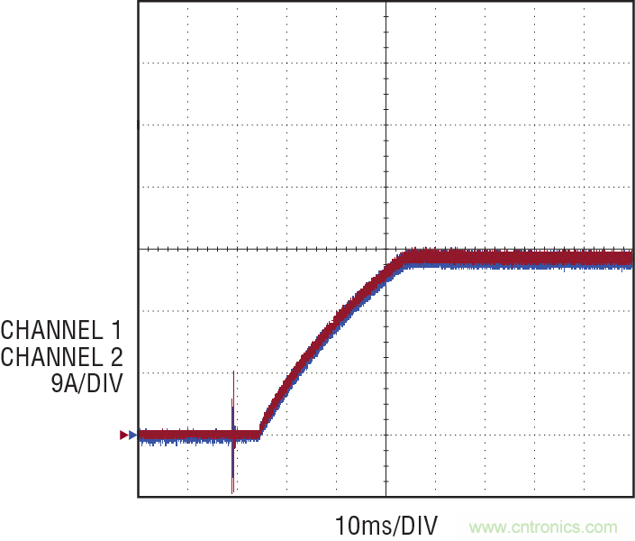 圖 8 顯示了一款 324W 轉(zhuǎn)換器,由兩個(gè)ADI DC2339A 演示電路板并聯(lián)組成。在這款設(shè)計(jì)中,每個(gè)并聯(lián)的控制器都產(chǎn)生 27A 電流,總共產(chǎn)生 54A 電流,電壓為 6V。通過(guò)將相應(yīng)的補(bǔ)償輸出連接到一起,兩個(gè)控制器協(xié)調(diào)一致地運(yùn)行,以提供平滑、良好的啟動(dòng)和準(zhǔn)確的 DC 調(diào)節(jié)。