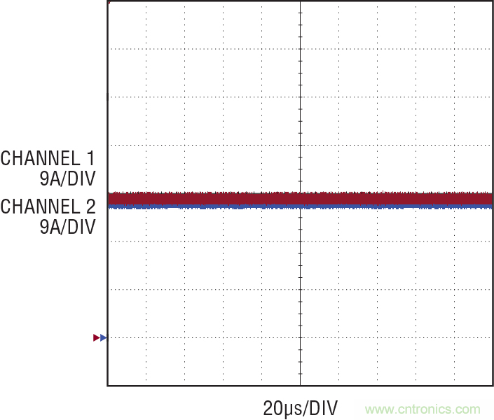 圖 10:在滿負(fù)載時(shí) LED DC 電流均分,兩個(gè)并聯(lián)驅(qū)動(dòng)器之間的電流差別非常小。