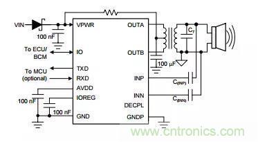 PGA460-Q1器件用于從6V至28V的輸入電壓范圍工作。在踢腳開啟后備箱應(yīng)用中,PGA460-Q1器件直接連接到汽車電池。適當(dāng)?shù)耐獠拷M件保護措施,例如瞬態(tài)電壓抑制(TVS)二極管有助于保護器件免受電池瞬態(tài)和反向電池電流的影響。