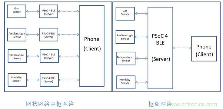 無(wú)線傳感器網(wǎng)絡(luò)通常作為網(wǎng)狀網(wǎng)絡(luò)和樞紐網(wǎng)絡(luò)(見(jiàn)圖1)。樞紐網(wǎng)絡(luò)包括可以放置在相同位置的所有傳感器。每個(gè)傳感器需要連接到單個(gè)BLE外圍設(shè)備(服務(wù)器)來(lái)處理數(shù)據(jù)并將其發(fā)送到BLE中央設(shè)備(客戶端)。網(wǎng)狀網(wǎng)絡(luò)采用可以遠(yuǎn)程定位傳感器的拓?fù)浣Y(jié)構(gòu)。網(wǎng)格中的每個(gè)節(jié)點(diǎn)都需要連接到BLE外圍設(shè)備(服務(wù)器),所有這些外圍設(shè)備都可以連接到BLE中央設(shè)備(客戶端)。