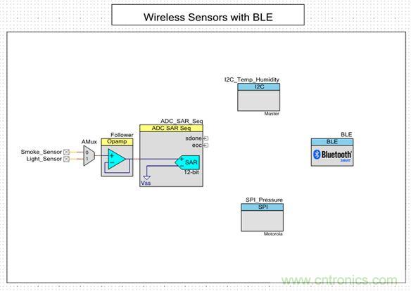 內(nèi)置BLE功能的處理器的靈活性和豐富資源,使傳感器能夠與單一BLE設(shè)備連接。圖2是使用PSoC Creator的典型配置。PSoC Creator是一個(gè)用于圍繞PSoC架構(gòu)開(kāi)發(fā)應(yīng)用程序的IDE。圖中顯示的是模擬和數(shù)字傳感器接口以及BLE子系統(tǒng)。該配置展示的是用于感測(cè)煙霧、光照強(qiáng)度、溫度、濕度和壓力的典型工業(yè)數(shù)據(jù)監(jiān)測(cè)系統(tǒng)。配置中的每個(gè)組件都有一個(gè)關(guān)聯(lián)的應(yīng)用程序編程接口(API),開(kāi)發(fā)人員可根據(jù)需要訪問(wèn)這些組件。每個(gè)組件還有一個(gè)與其相關(guān)的數(shù)據(jù)表對(duì)組件的可用配置進(jìn)行說(shuō)明。
