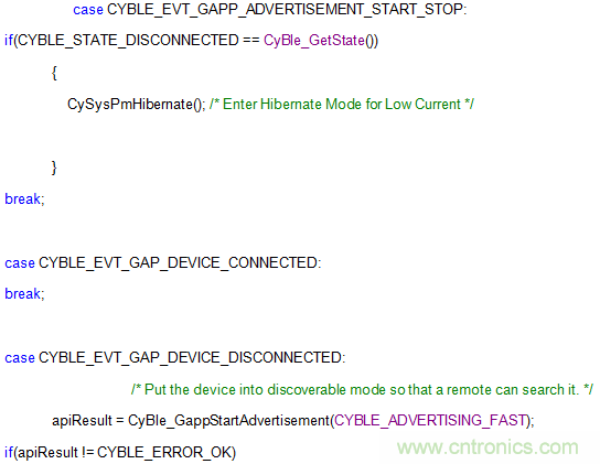 如上文所述,處理器和BLE子系統(tǒng)(BLESS)具有獨(dú)立的低功率模式。舉個(gè)例子,如果設(shè)備斷開(kāi)連接,我們可以將處理器設(shè)置為休眠或停止模式以降低功耗。在廣播和連接間隔之間,我們可以利用BLESS深度睡眠模式,甚至連所使用的各個(gè)組件(如ADC、I2C等)也可以進(jìn)入各自的低功率模式并在需要時(shí)喚醒。因此,開(kāi)發(fā)人員能夠根據(jù)整個(gè)系統(tǒng)的實(shí)際需要,對(duì)功率進(jìn)行非常細(xì)致的控制。有關(guān)詳細(xì)的低功率代碼片段,請(qǐng)點(diǎn)擊文末閱讀原文觀看低功耗藍(lán)牙應(yīng)用的低功率設(shè)計(jì)與電池壽命估算。