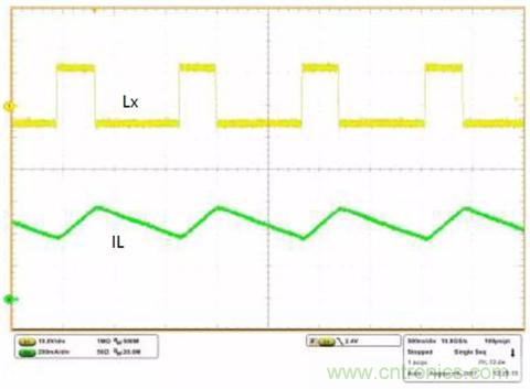 在高壓側開關接通的周期中(圖5中綠色箭頭指示電流),電感器電流斜坡上升,將能量儲存在電感器中,輸出電容器向負載提供電流。在低壓側開關接通的周期中(圖5中紅色箭頭指示電流),電感器電流斜坡下降,向負載提供電流,并為輸出電容器充電。ISL85415EVAL2Z反相降壓-升壓電路板的工作波形如圖6所示。