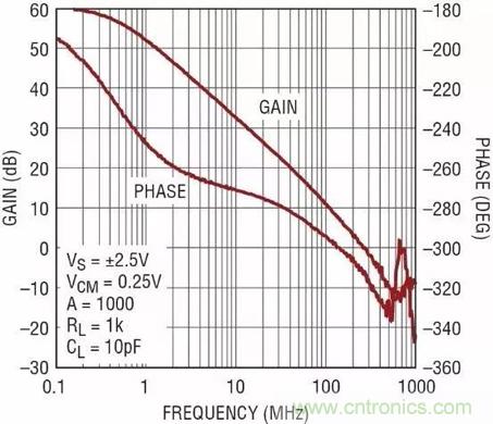 圖 2 顯示了 LTC6268 放大器隨頻率變化的開環(huán)增益和相位響應(yīng)。LTC6268是一款小巧的小型低噪聲 500MHz 放大器,具軌至軌輸出和僅 3fA 偏置電流,可以作為一個很好的例子來說明真實(shí)放大器的行為表現(xiàn)。主極點(diǎn)補(bǔ)償?shù)?–90° 相位滯后約從 0.1MHz 開始,在 8MHz 左右達(dá)到 –270°,超過 30MHz 時(shí)則下移超過 –270°。實(shí)際上,除了由于額外增益級和輸出級所引起的基本主導(dǎo)補(bǔ)償滯后之外,所有的放大器都具有高頻相位滯后。通常,額外相位滯后的起點(diǎn)在 GBF/10 左右。